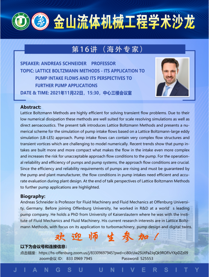 Jin Shan Fluid Mechanical Engineering Academic Salon Lecture 16 is due to start at 15:30 on November 22nd. Prof. ANDREAS SCHNEIDER is invited to give a report, we welcome you to participate in it.