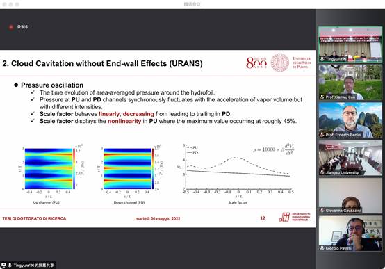 答辩会上,尹庭赟就其博士论文工作“Numerical Analyses on Unsteady Cavitating Flow”进行了汇报,并回答了答辩委员会专家针对研究工作的质疑和提问。其研究工作得到了答辩委员会专家的高度评价,同意授予其意大利帕多瓦大学和禁忌书屋 双博士学位。该博士论文在非定常空化相关流动机制、不稳定性特征和潜在抑制方法等方面取得了重要成果,已在 Ocean Engineering、International Journal of Multiphase Flow、ASME Journal of Fluids Engineering、Journal of Fluids and Structures 等本领域重要国际期刊发表学术论文,答辩委员会一致同意给予该博士论文“cum laude”荣誉(优秀博士论文)。